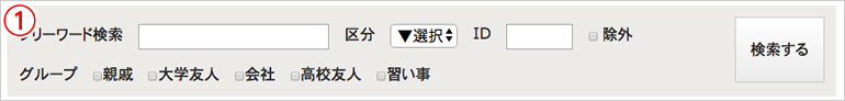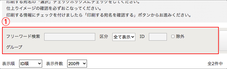 フリーワード検索で氏名などで検索することができます。区分は、個人か企業かを絞り込むことができます。IDは宛名の列の先頭に記載されている番号を検索できます。除外にチェックをつけると、印刷除外設定をしている宛名のみを表示します。グループでは表示したいグループ名にチェックをつけて絞り込むことができます。(複数チェックをつけることも可能です。
