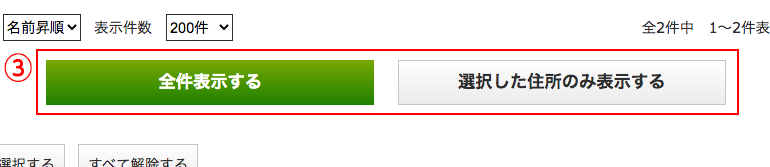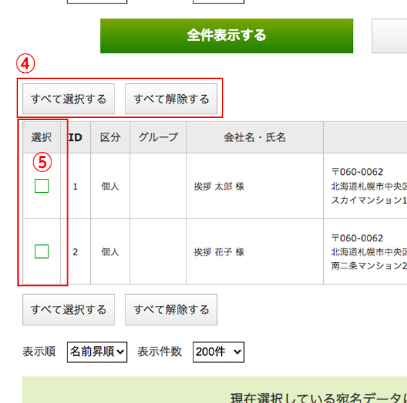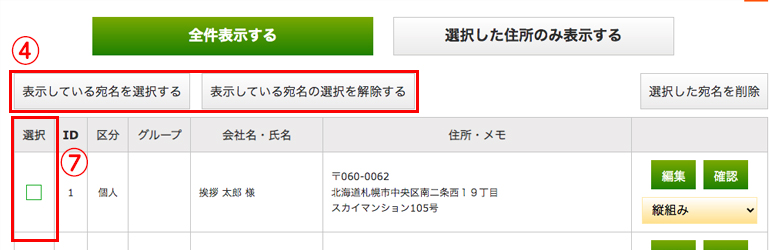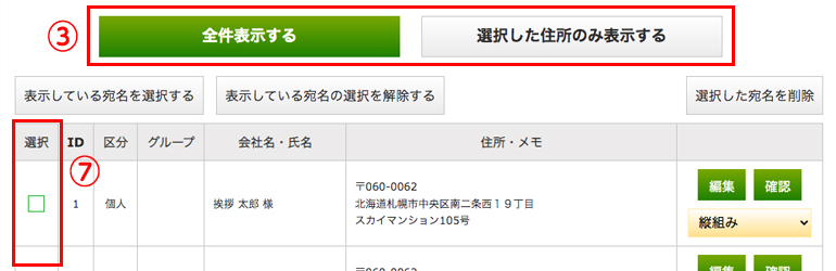 ⑦でチェックを入れた宛名情報を③で「全件表示する」「選択した住所のみ表示する」から表示を切り替える事ができます。