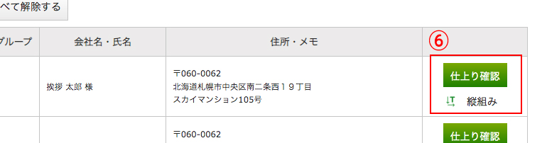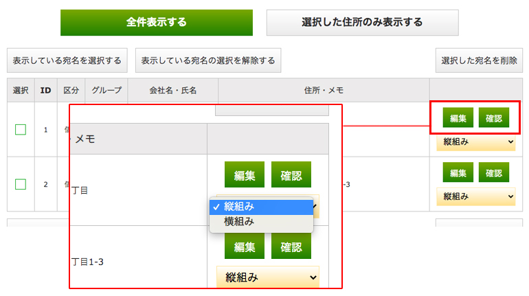 ⑥各宛名ごとに印字方向を変更できます。アルファベット表記のある住所などは横組みをご利用いただくと便利です。