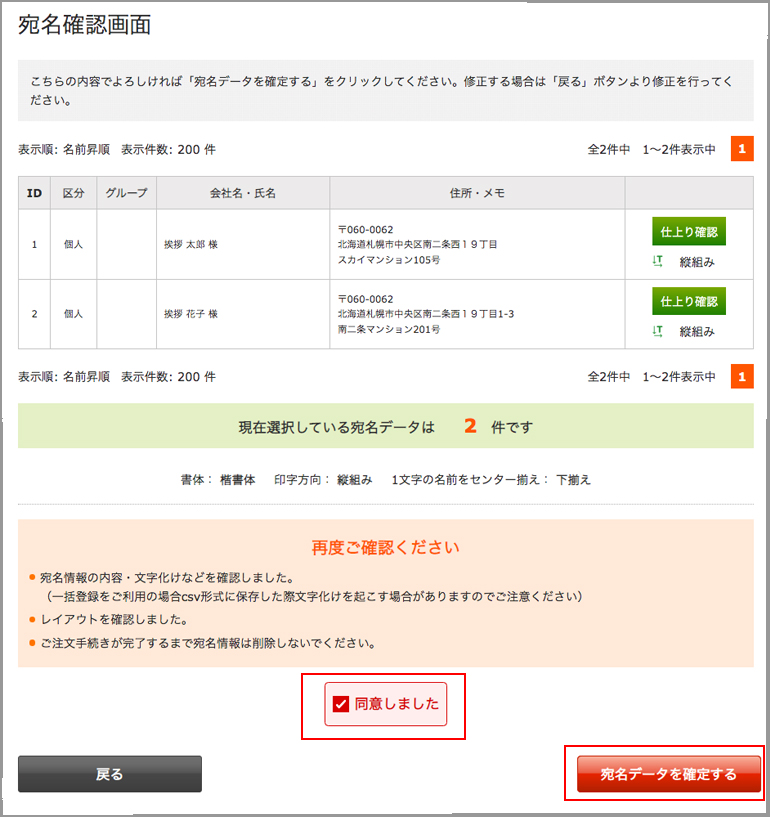 宛名確認画面にて内容のご確認をお願いいたします。個人情報の同意にチェックを入れ「宛名データを確定する」ボタンから次に進みます。