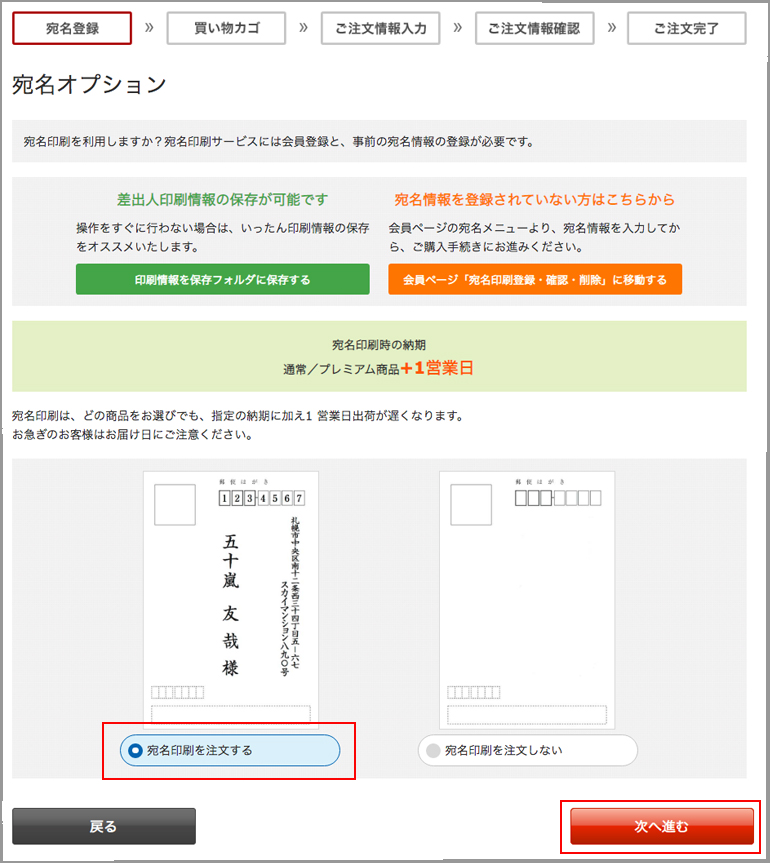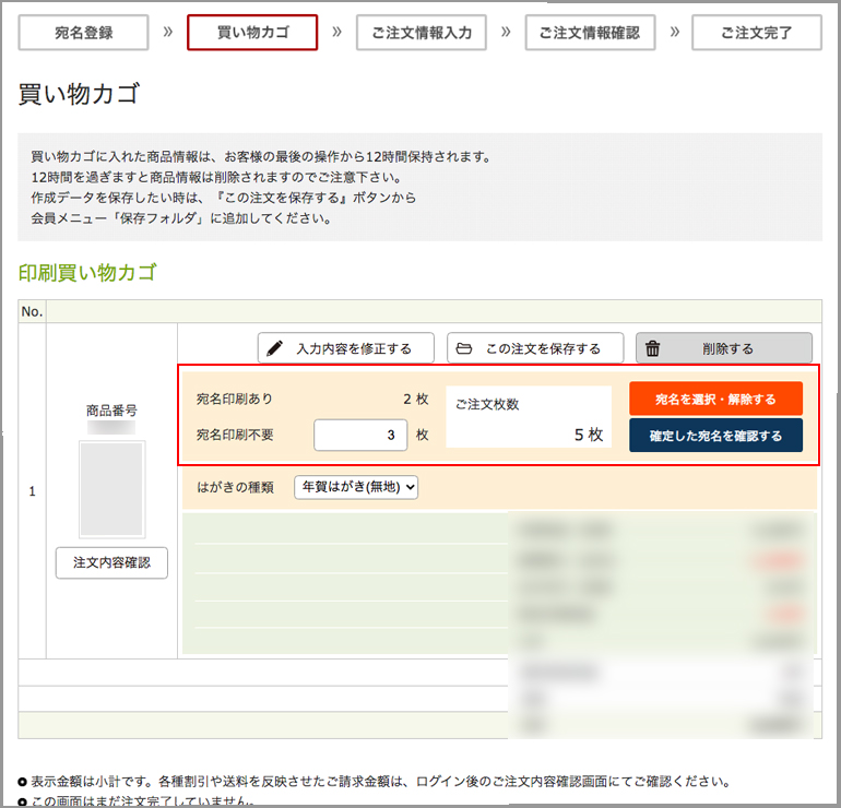 買い物カゴの宛名印刷ありに印刷枚数が表示されます。宛名を印刷しないご注文は、「宛名印刷不要」のフォームに枚数をご入力ください。