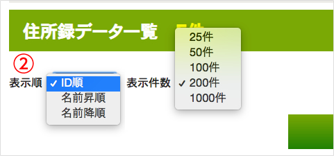 ②表示順では、ID順、氏名での昇順、降順で並び替えが可能です。