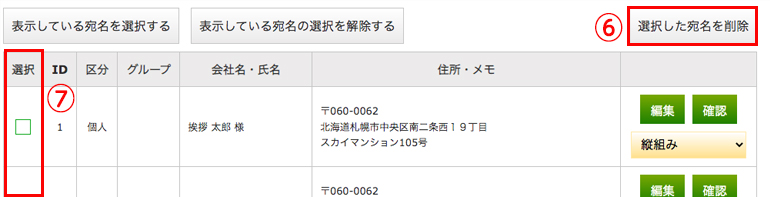 ⑦を選択してから⑥の「選択した宛名を削除」ボタンで、チェックをつけた宛名データを削除する事ができます。