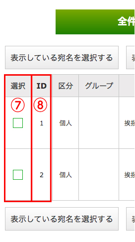 ⑧は宛名に自動で割り振られたIDになります。削除した項目は欠番になります。IDを変更することはできません。