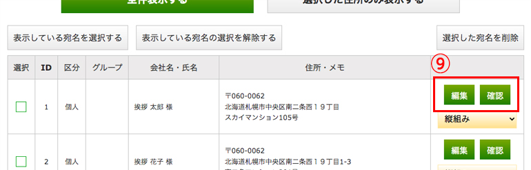 ⑨修正をしたい宛名データの「編集」ボタンから宛名データの修正が可能です。
