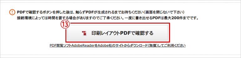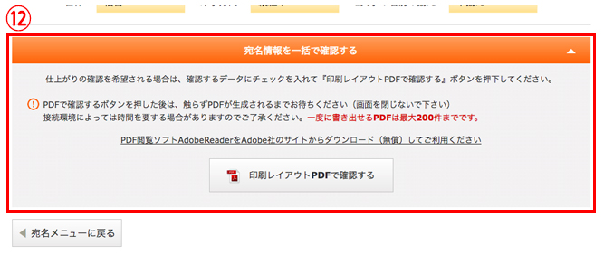 ⑫確認したい宛名を⑦でチェックして選択し、⑫の「印刷レイアウトPDFで確認する」ボタンをクリックします。