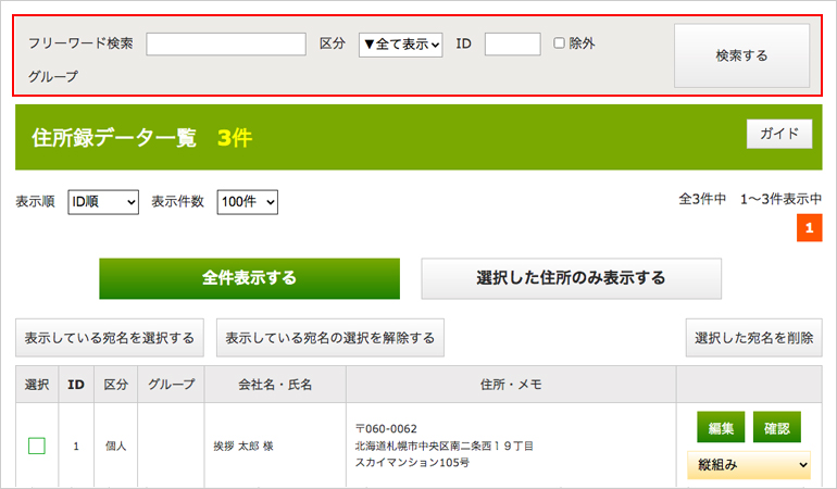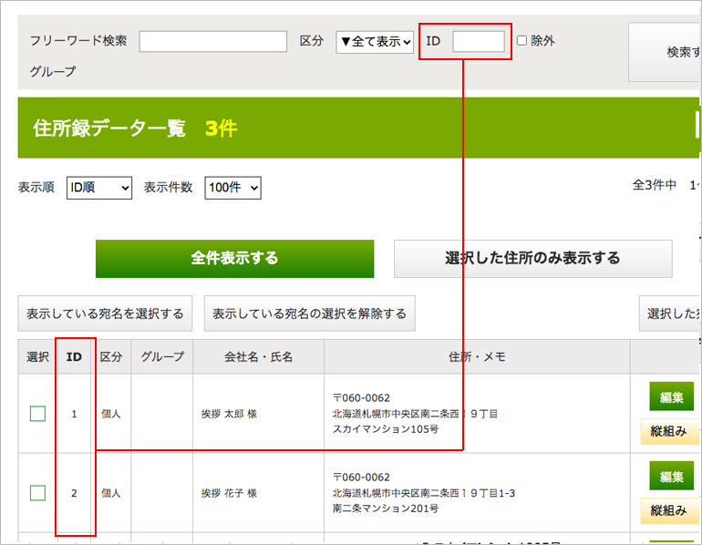 IDとは宛名検索一覧で登録時に自動で割り振られる番号です。IDの番号で検索する事が可能です。