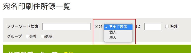 区分選択では個人・法人を分けて検索結果を表示する事が可能です。