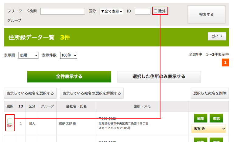 除外チェックのついている宛名情報を抽出して表示させる事が可能です。除外チェックの解除の際に検索結果を表示させ解除などでご利用いただけます。 ※除外チェックとは、印刷時に注文から外すことができるチェックです。 喪中の方など年賀状を送る事ができない方など除外チェックを入れておくと誤印刷を防ぐことができます。