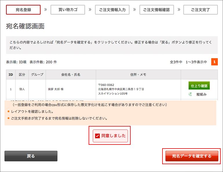 選択した宛名に問題がなければ、個人情報に「同意しました」にチェックをつけて、「宛名データを確定する」ボタンをクリックします。